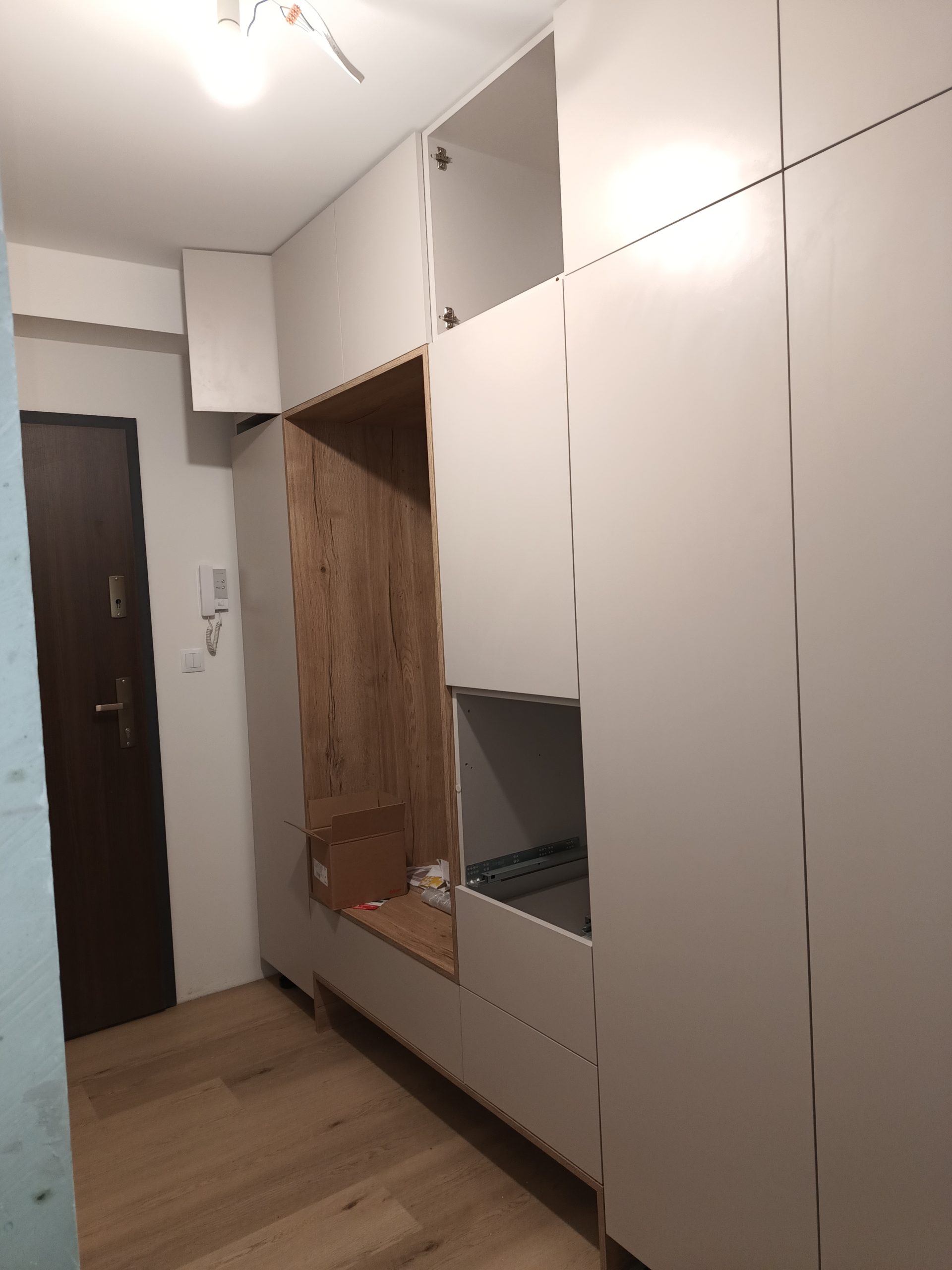 płyta laminowana Egger lub Swiss Krono, fronty akrylowe lub lakierowane MDF, forniry naturalne, systemy przesuwne Sevroll, szkło lacobel, lustra, płyty tekstylne, akcesoria Blum lub GTV z cichym domykaniem, pantografy, kosze cargo.