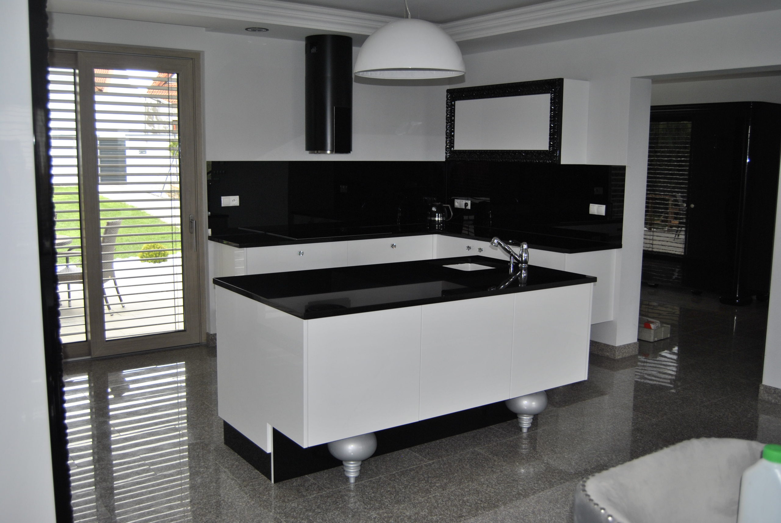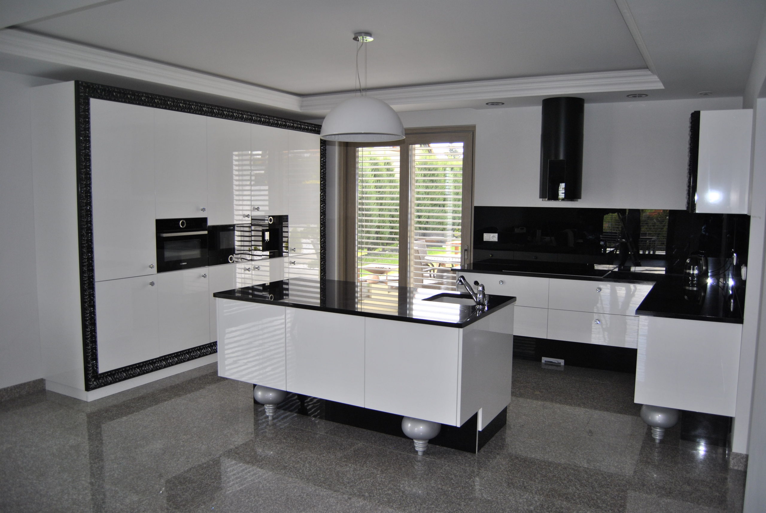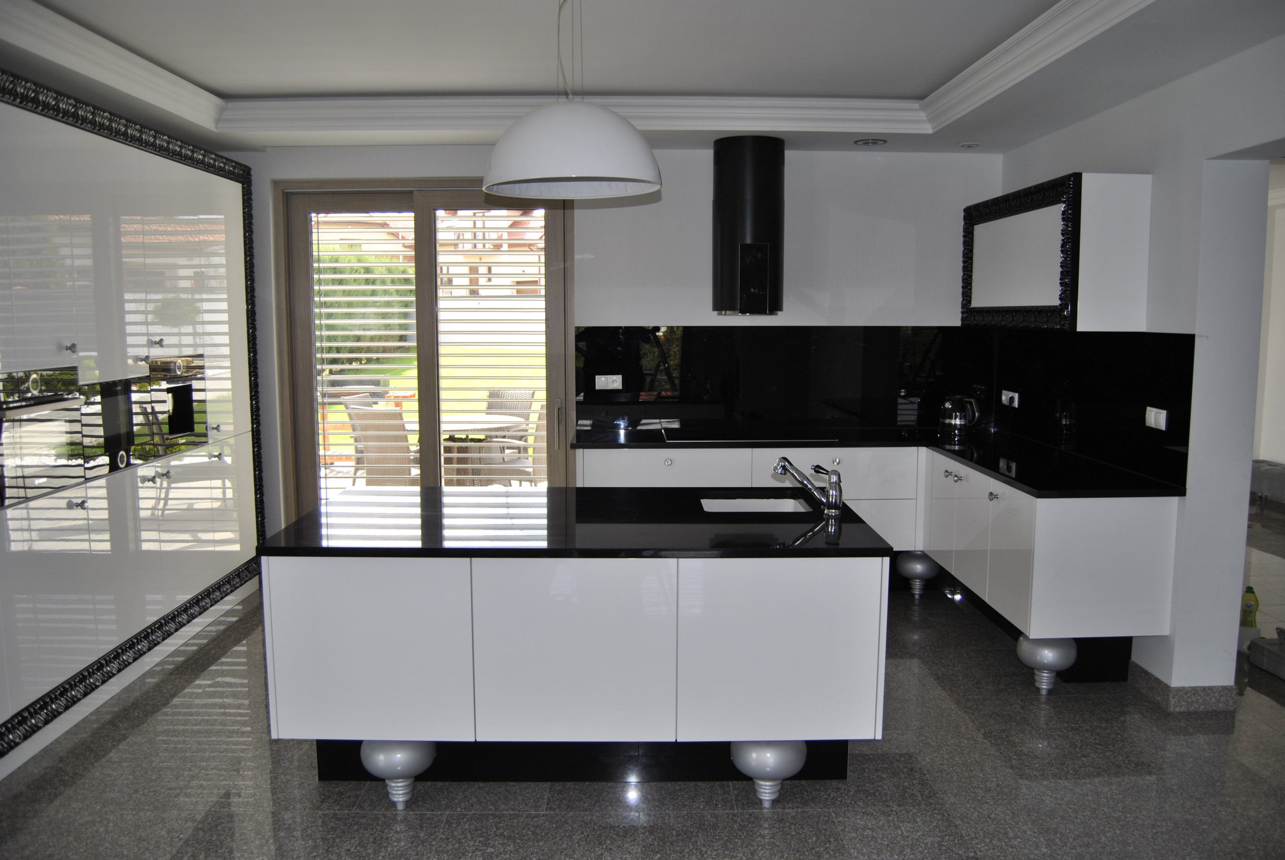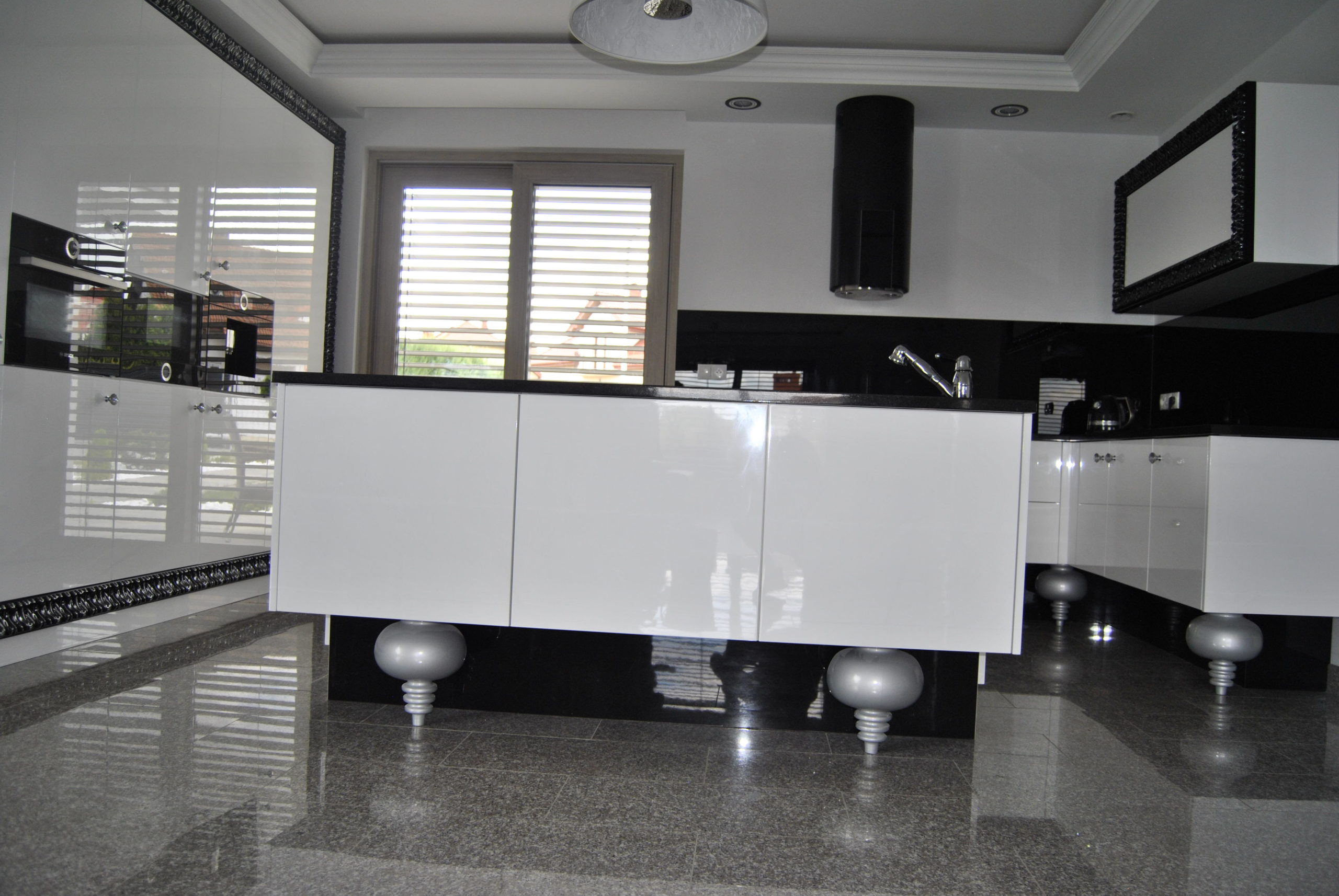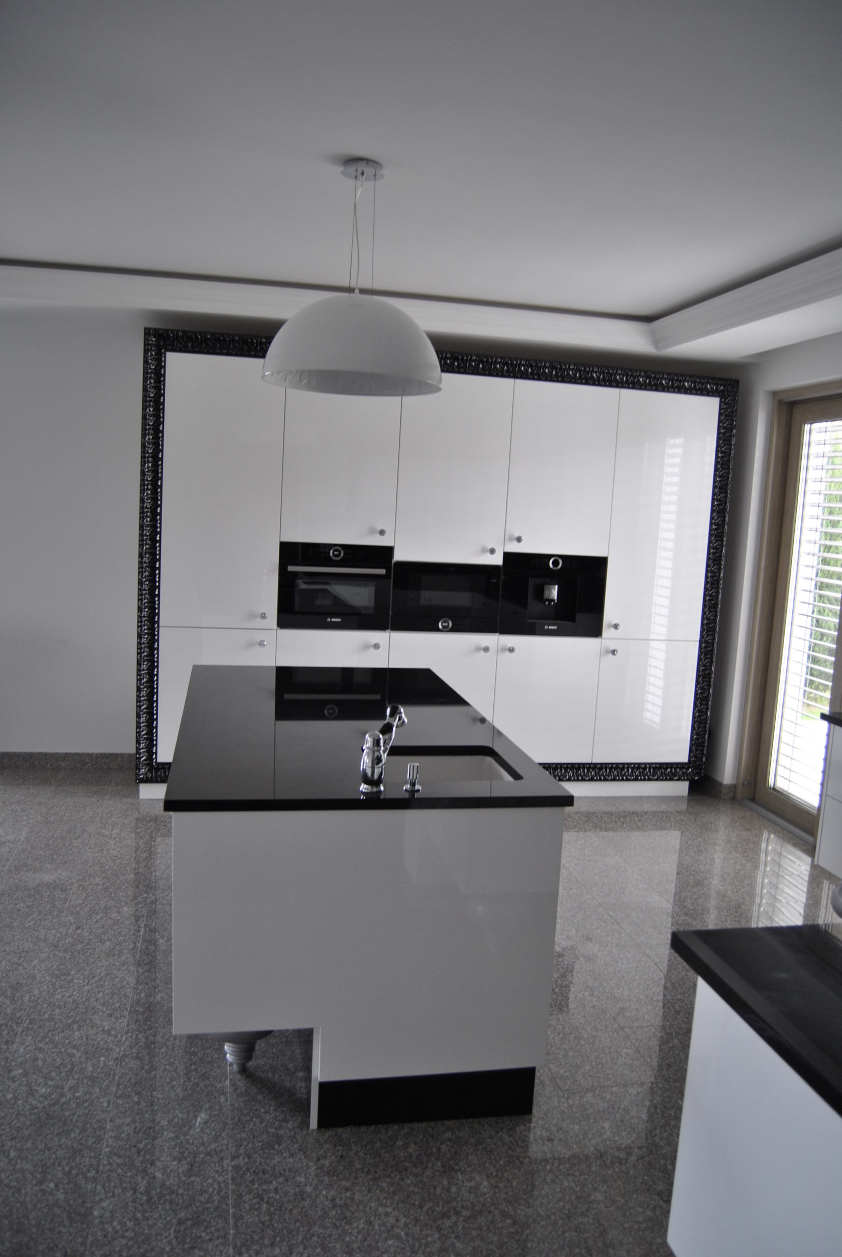 Fronty lakierowane na wysoki połysk lub szklane, blaty kwarcowe lub marmurowe, złote lub czarne uchwyty, szkło hartowane, dekoracyjne oświetlenie LED oraz systemy Blum lub Hettich.