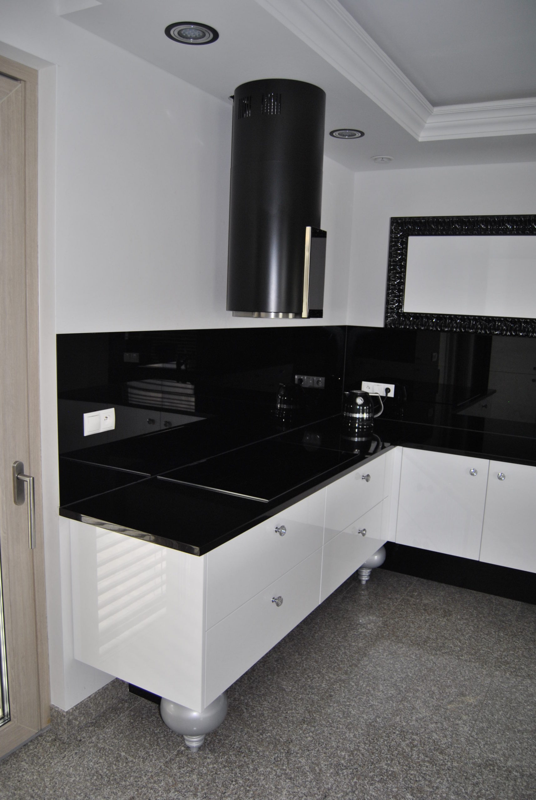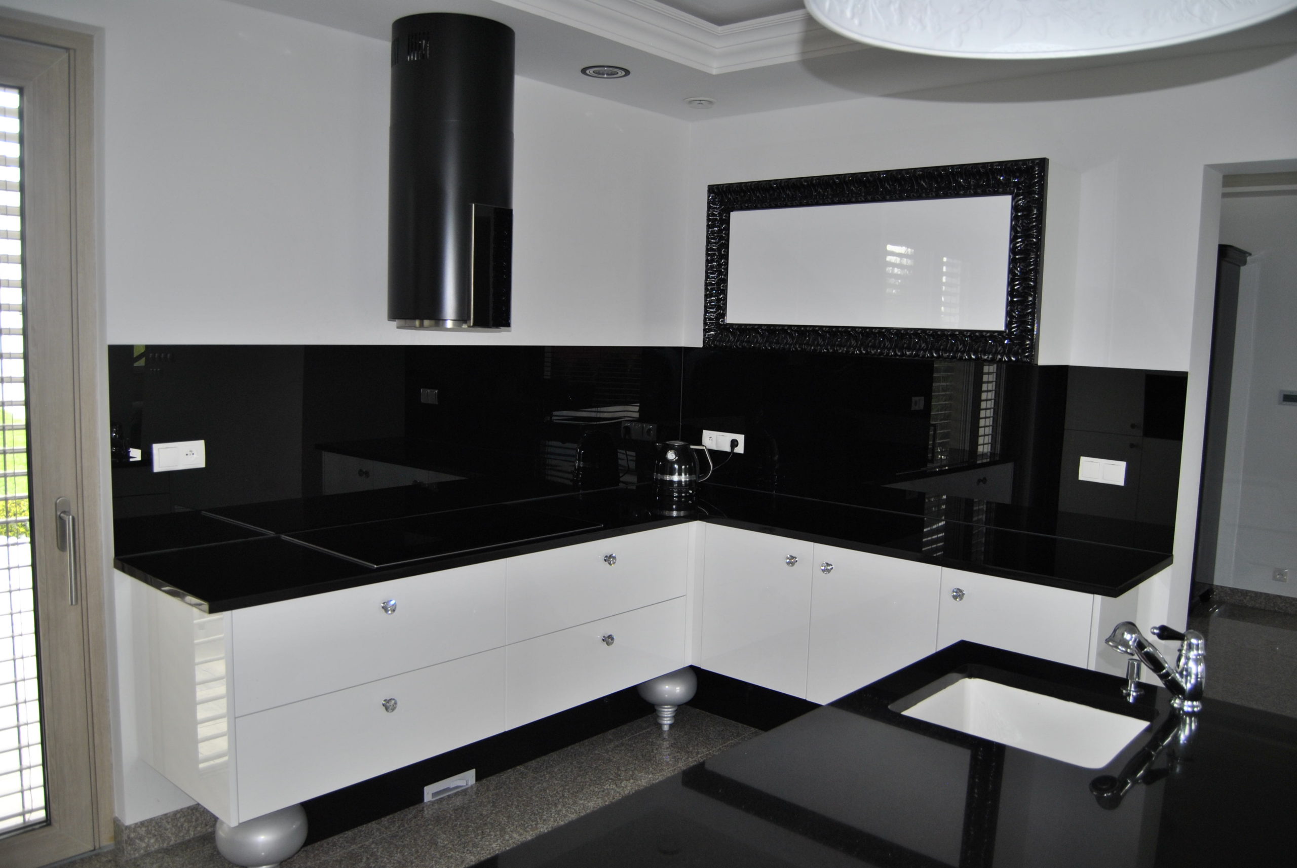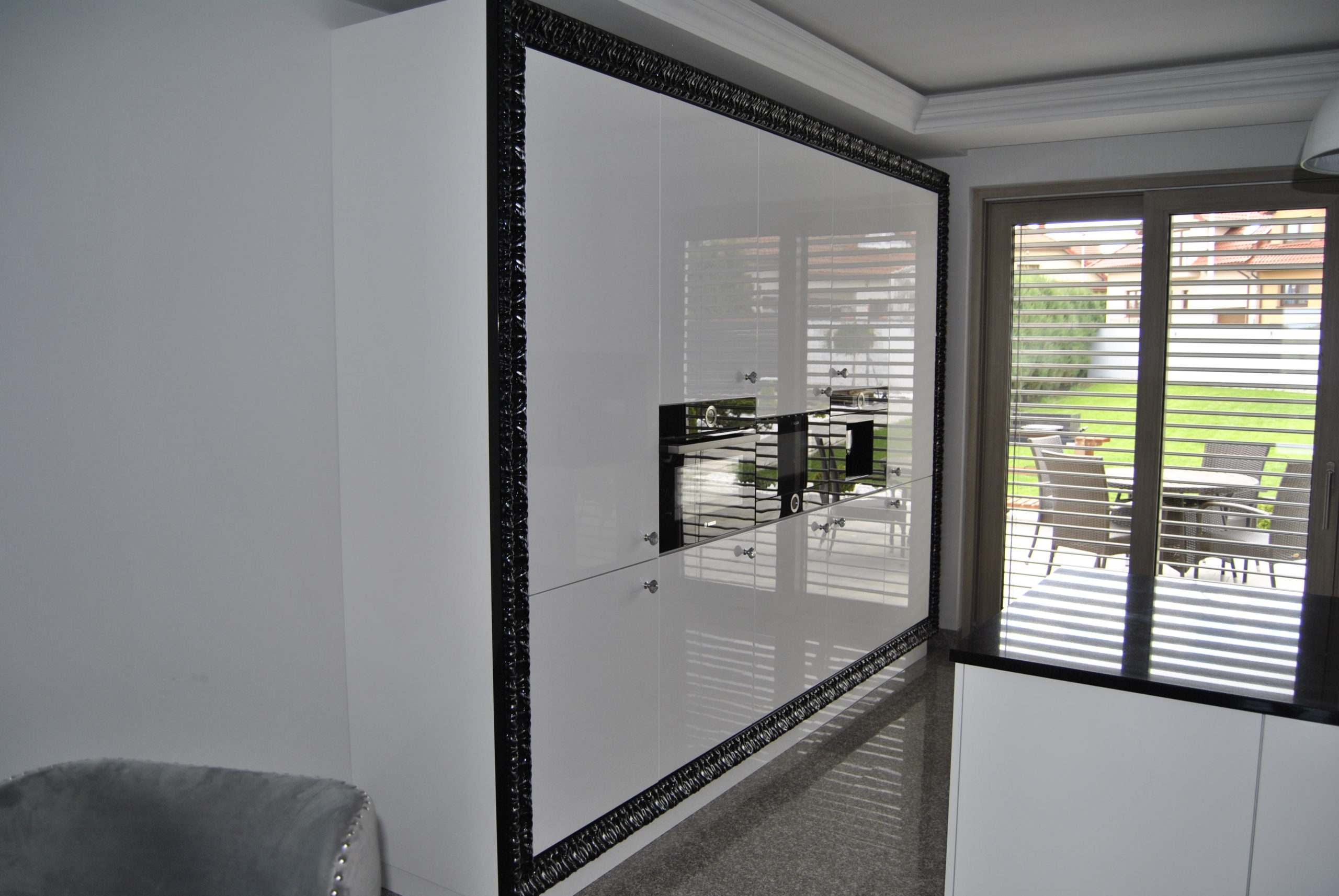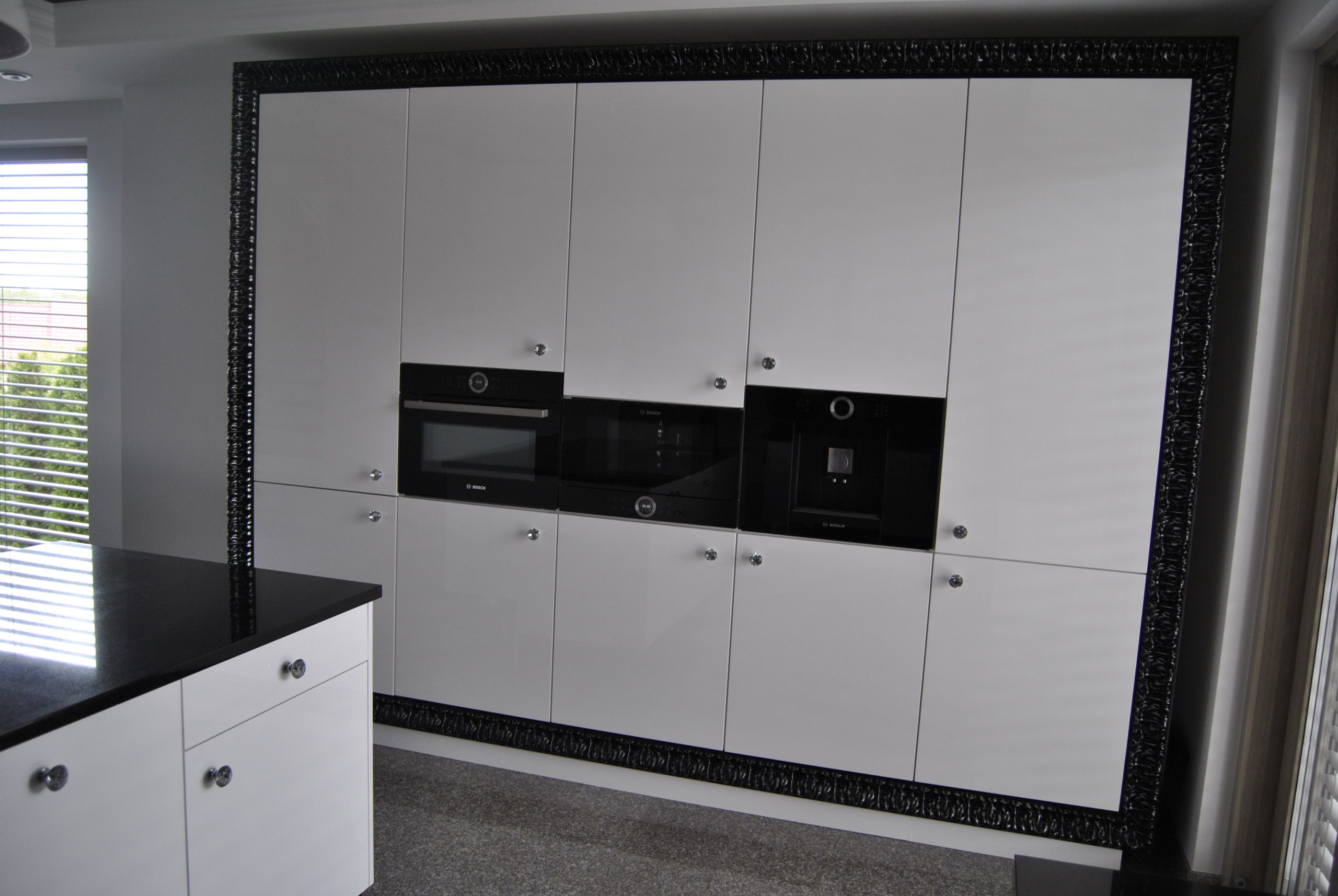 Fronty lakierowane na wysoki połysk lub szklane, blaty kwarcowe lub marmurowe, złote lub czarne uchwyty, szkło hartowane, dekoracyjne oświetlenie LED oraz systemy Blum lub Hettich.