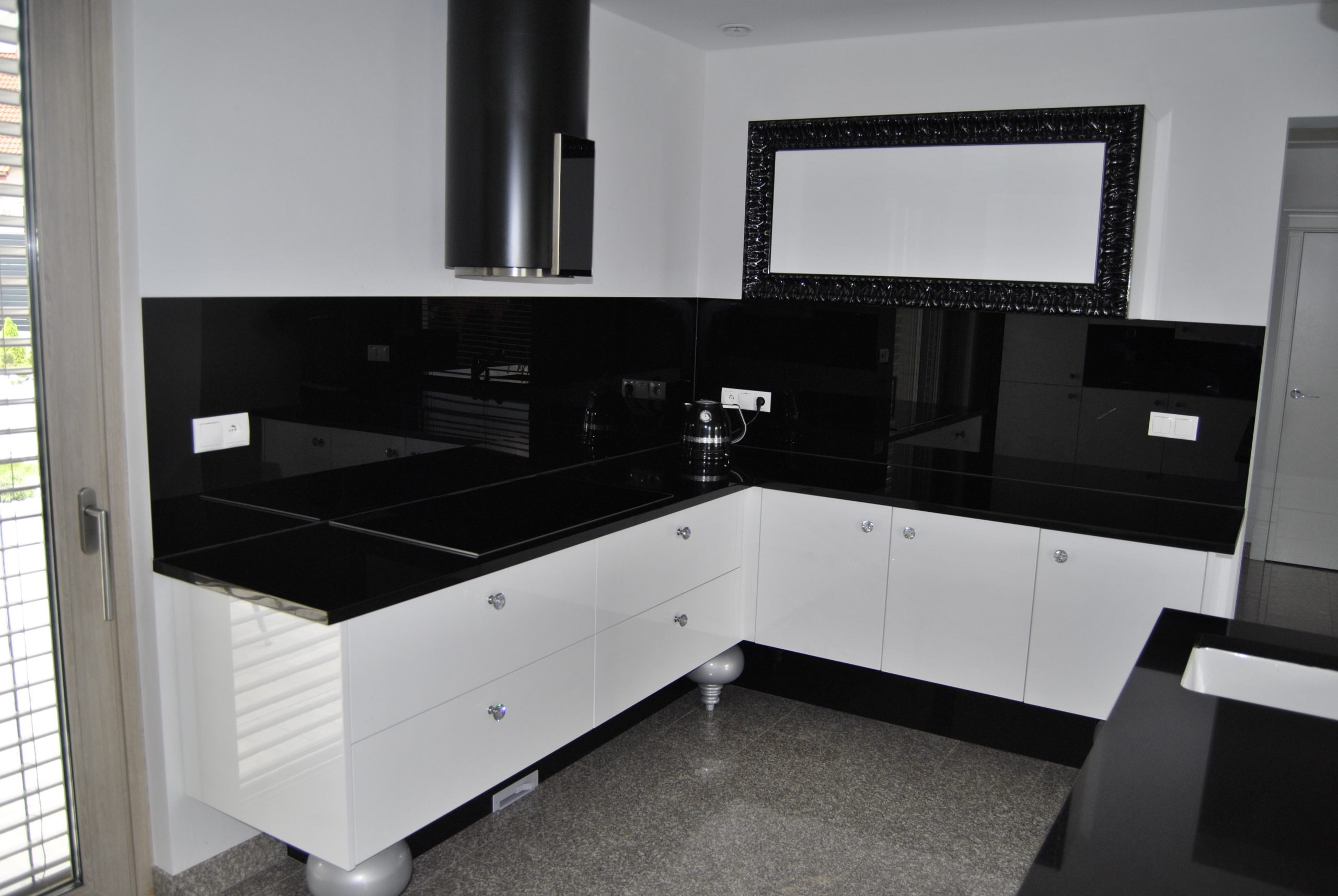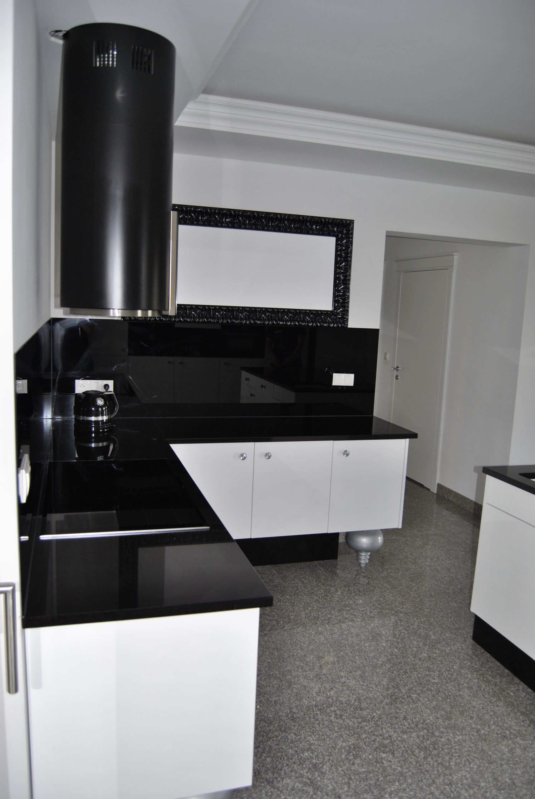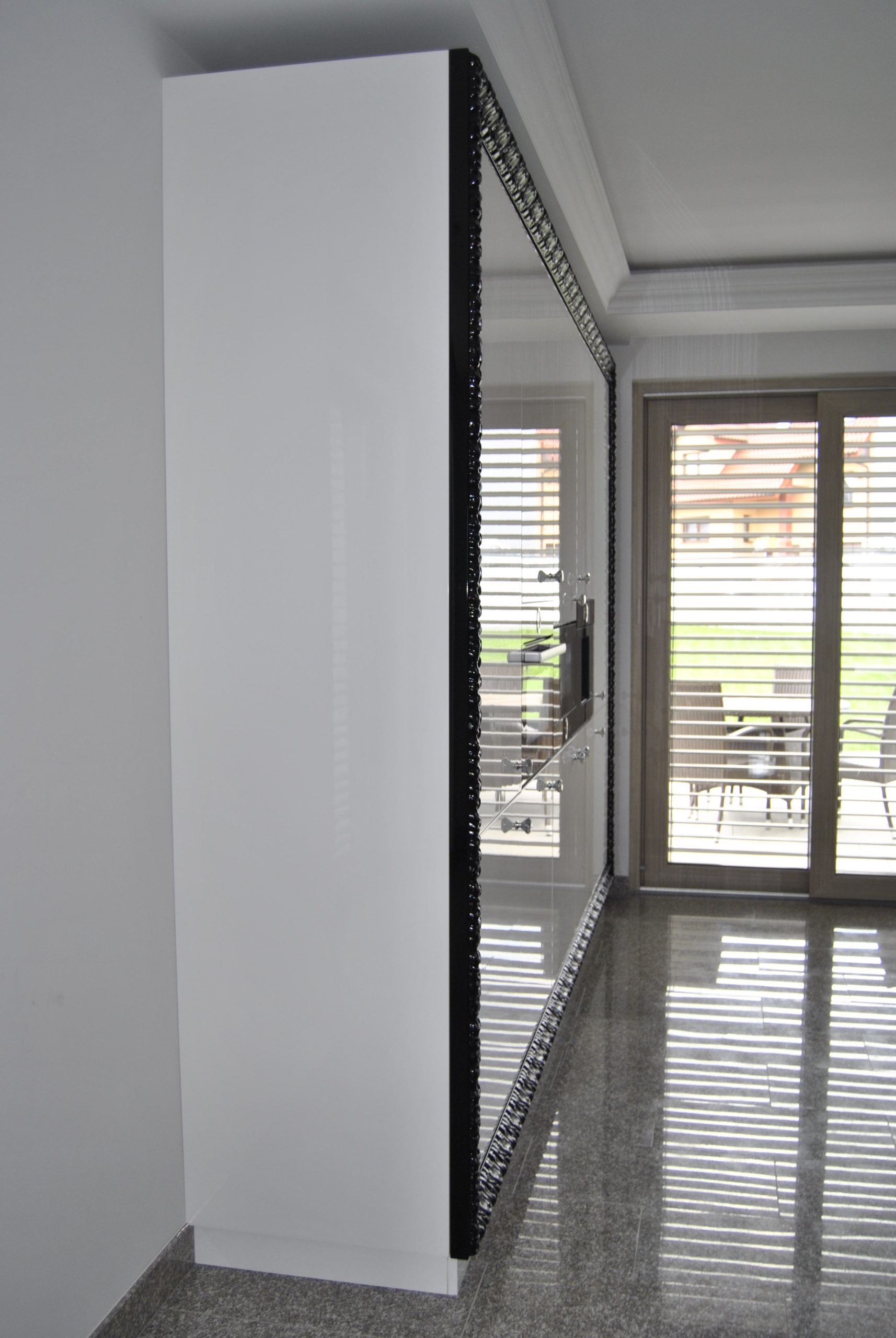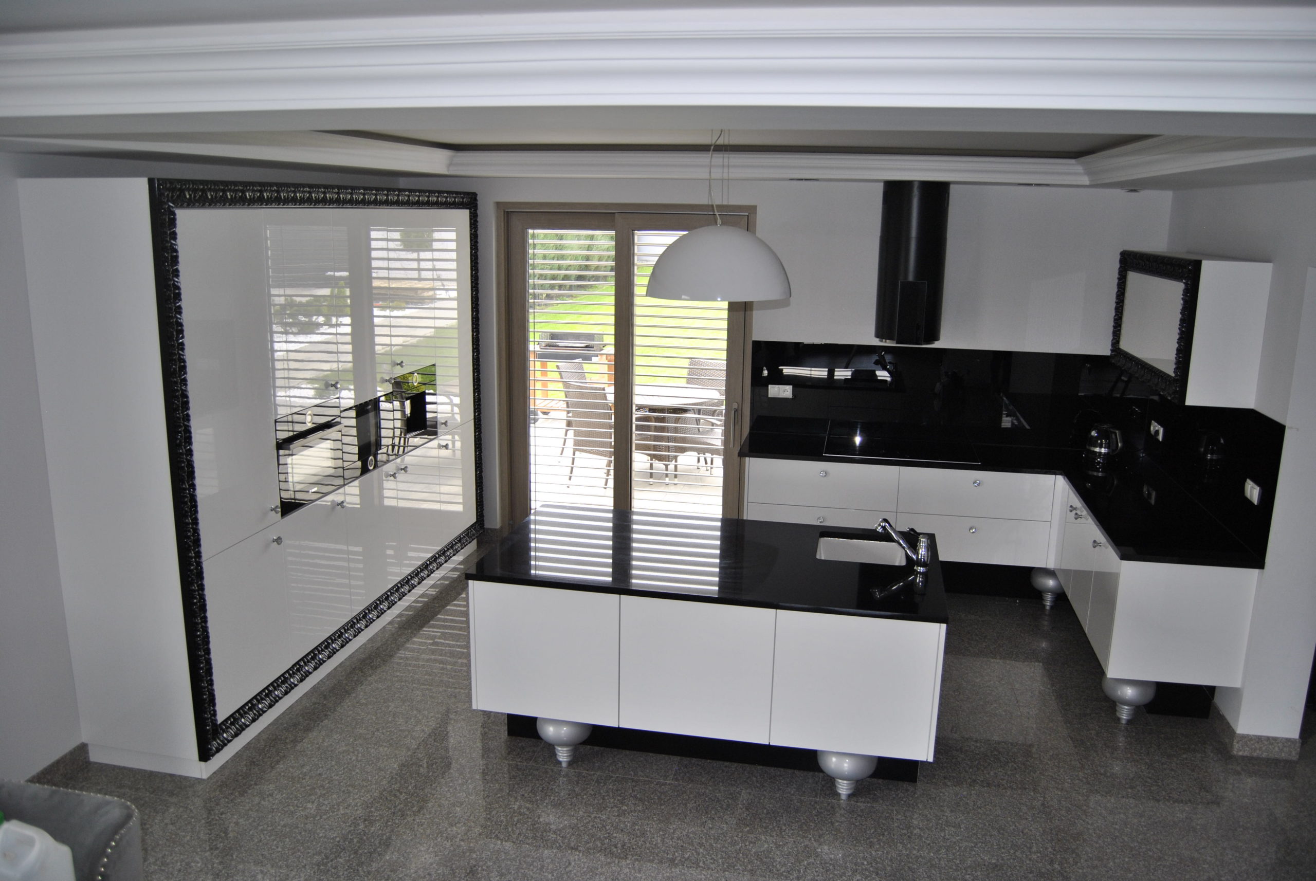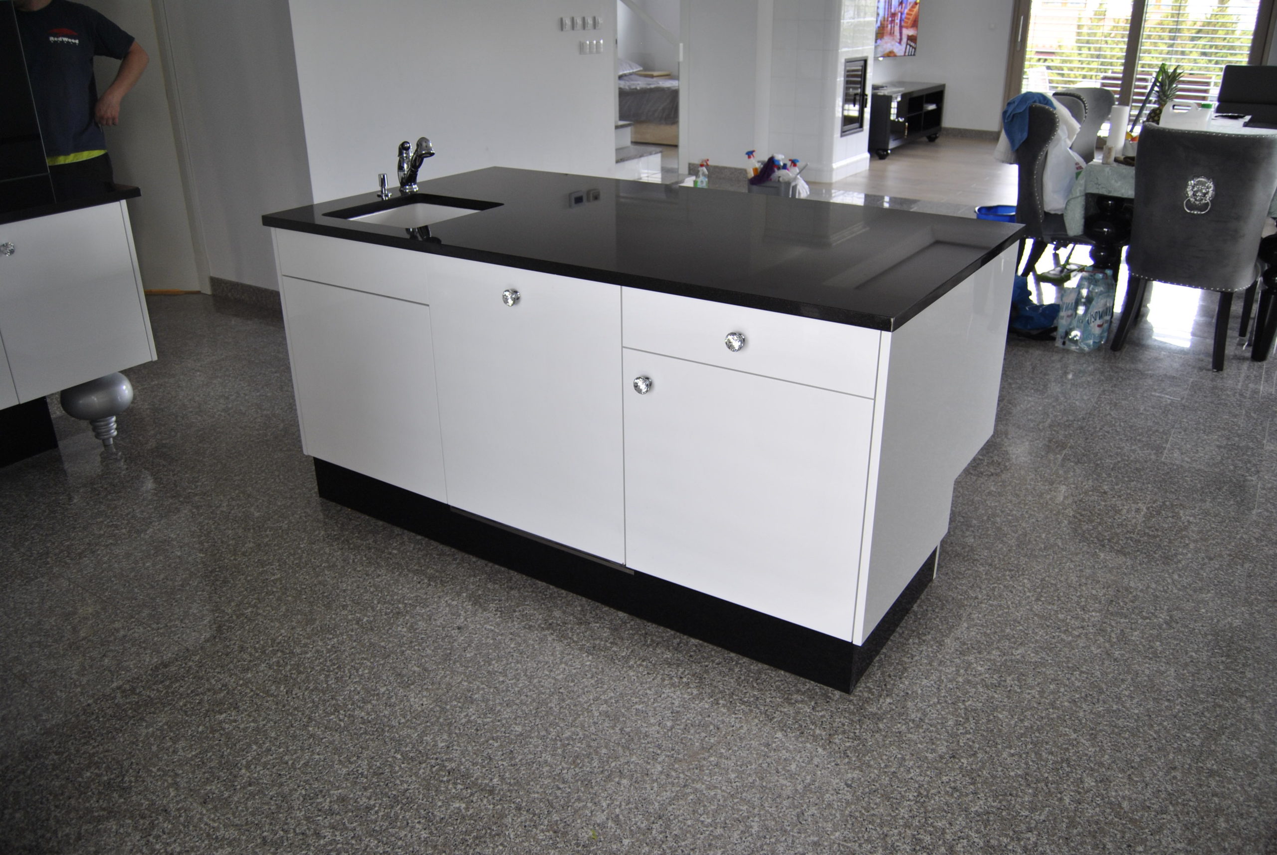 Fronty lakierowane na wysoki połysk lub szklane, blaty kwarcowe lub marmurowe, złote lub czarne uchwyty, szkło hartowane, dekoracyjne oświetlenie LED oraz systemy Blum lub Hettich.