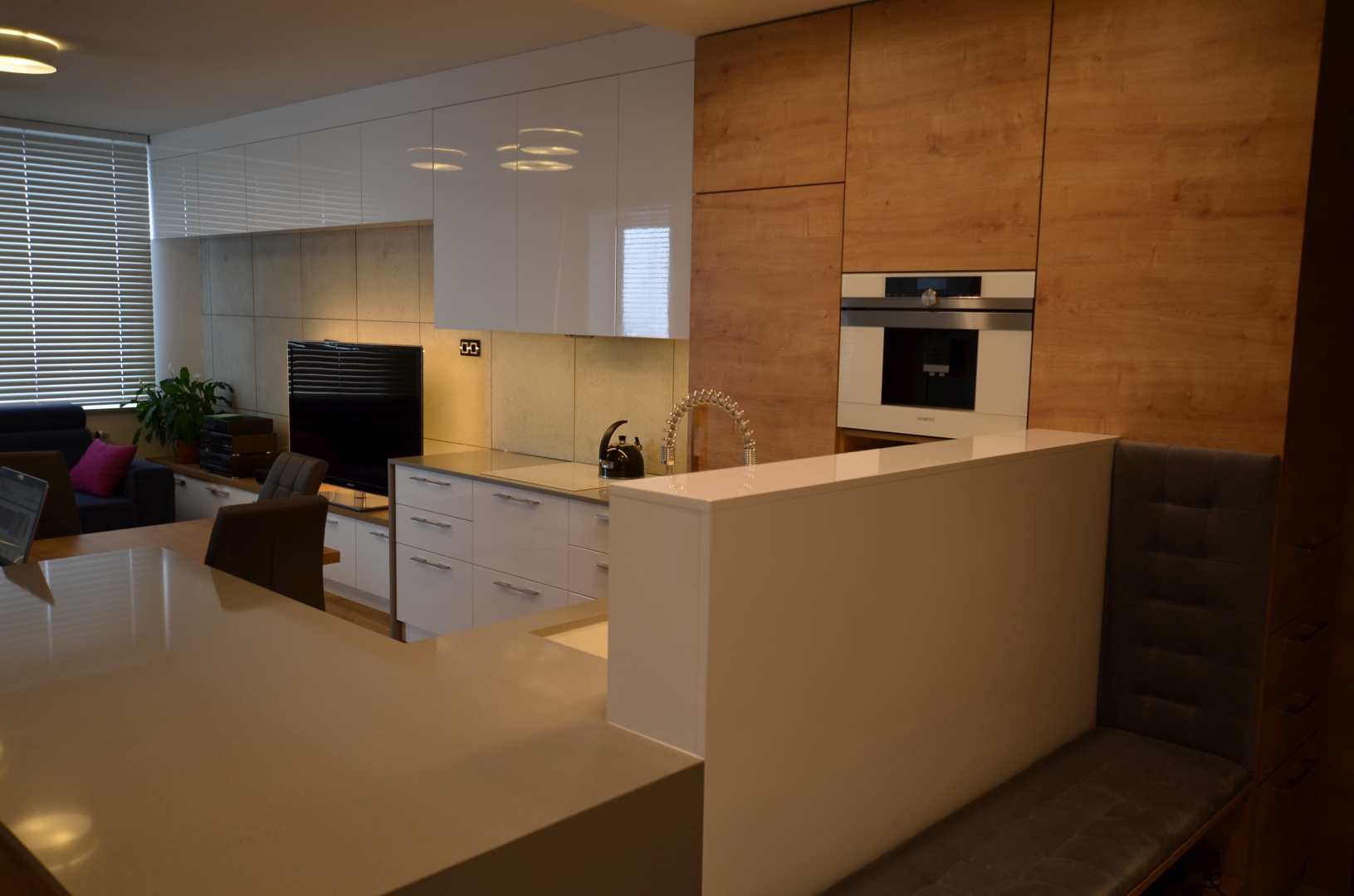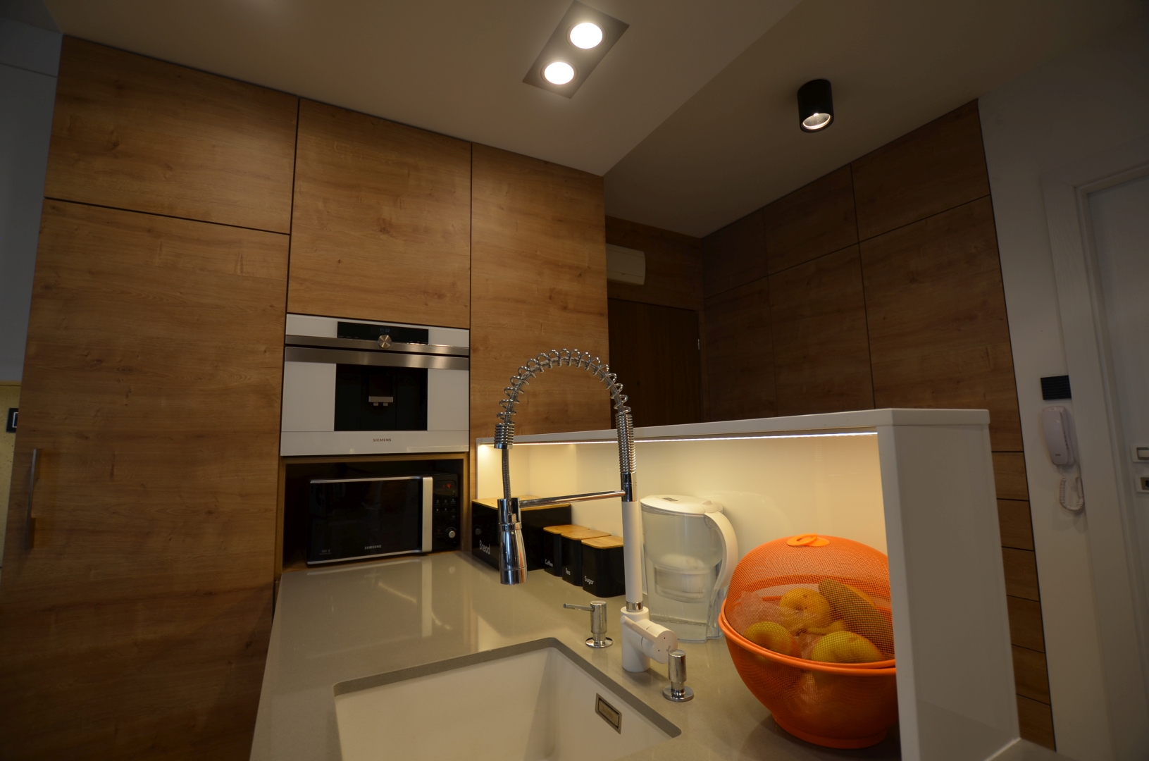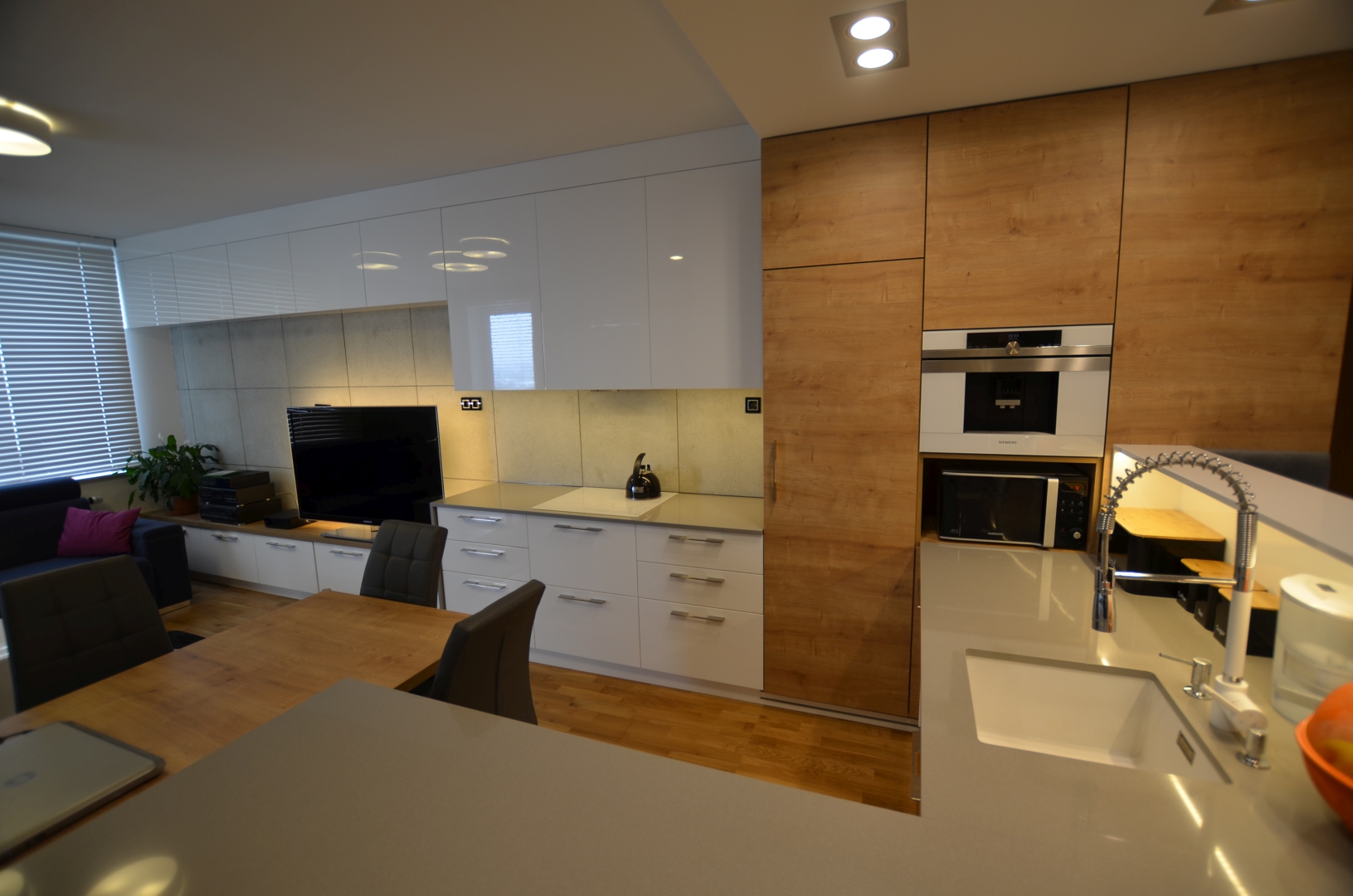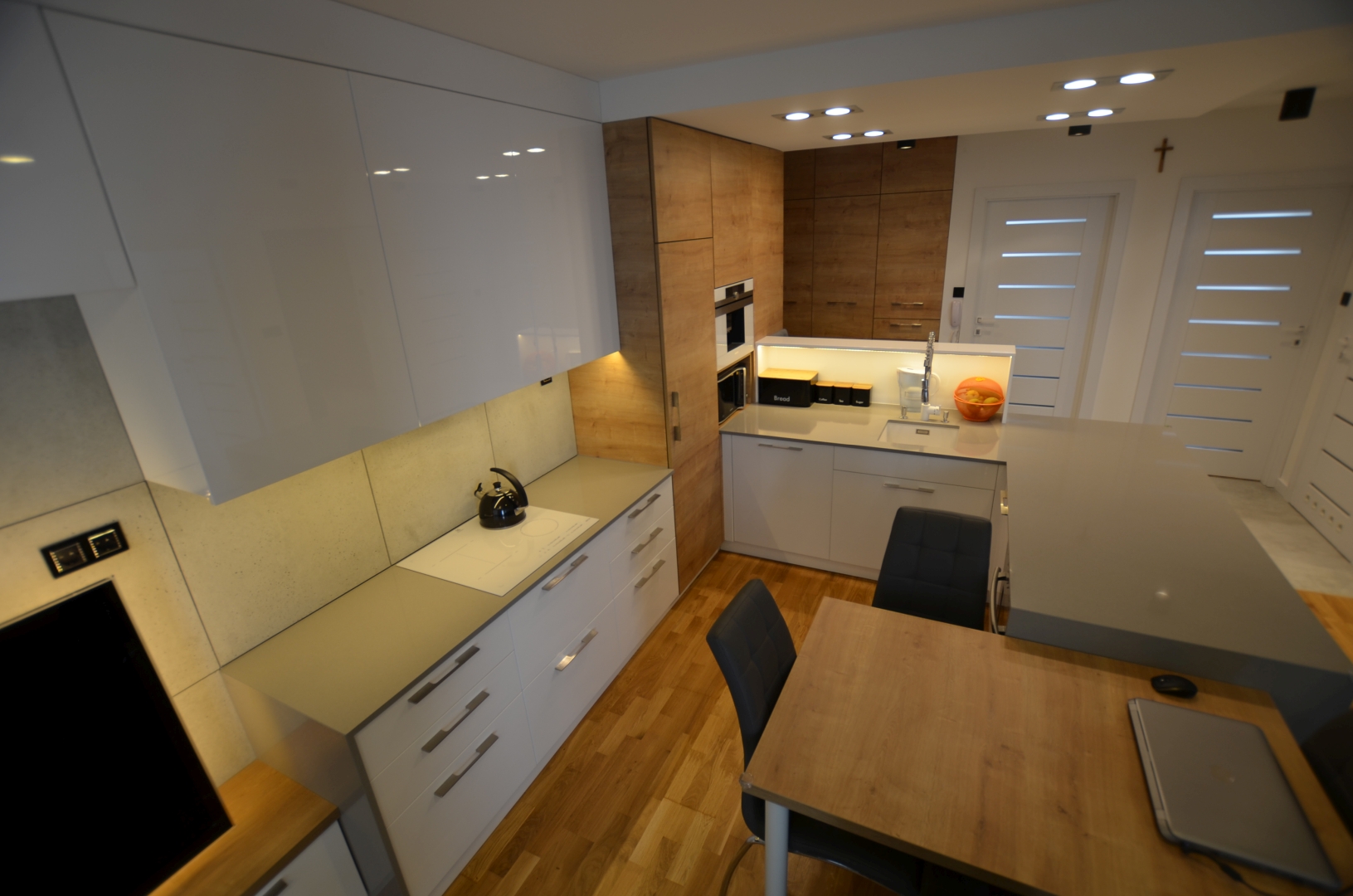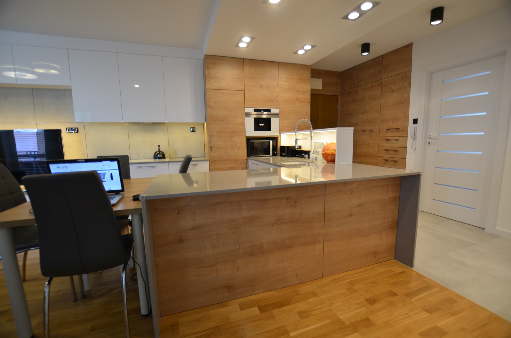 Fronty lakierowane w połysku, płyty meblowe o strukturze naturalnego drewna, blat kamienny, szkło hartowane, systemy Blum, oświetlenie LED.